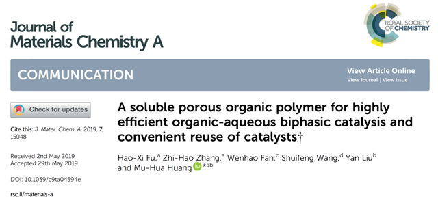 有機(jī)多孔聚合物(POPs)是一種新興的多孔材料,具有廣泛的應(yīng)用前景。北京理工大學(xué)材料學(xué)院的黃木華課題組長期以來關(guān)注功能性有機(jī)多孔聚合物的實(shí)用制備及應(yīng)用技術(shù)。該小組先后實(shí)現(xiàn)了Cu粉催化的Ullmann偶聯(lián)反應(yīng)制備硝基功能化的有機(jī)多孔材料NO2-PAF-1(Polym. Chem., 2016, 7, 770),利用NaBH4介導(dǎo)的還原偶聯(lián)反應(yīng),快速制備了偶氮鍵鏈接的有機(jī)多孔聚合物材料Azo-POP-1、Azo-POP-2和Azo-POP-3(J. Mater. Chem. A, 2018, 6, 5608)。該工作報(bào)道了第一例可溶性的Azo-POPs,并創(chuàng)新性地將可溶性的Azo-POPs用于有機(jī)/水兩相催化反應(yīng),取得了良好的催化效果和催化劑的循環(huán)使用性,為可持續(xù)發(fā)展提供了技術(shù)支持。該工作發(fā)表在《Journal of Materials Chemistry A》 (A Soluble Porous Organic Polymer for Highly Efficient Organic-Aqueous Biphasic Catalysis and Convenient Reuse of Catalysts, 2019. 7 (25): p. 15048-15053. DOI: 10.1039/C9TA04594E)(SCI頂級期刊,影響因子10.73)上。碩士研究生付浩熹為該論文的第一作者,黃木華特別研究員為通訊作者。該工作得到了國家自然科學(xué)基金(No. 21772013)、北京市自然科學(xué)基金(No. 2162039)以及中央高?;究蒲袠I(yè)務(wù)費(fèi)專項(xiàng)基金的大力資助。同時(shí),該工作也得到了材料學(xué)院先進(jìn)材料實(shí)驗(yàn)中心的大力支持。