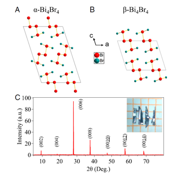 圖1 (A)α-Bi4Br4和(B)β-Bi4Br4的準(zhǔn)一維晶體結(jié)構(gòu);(C)α-Bi4Br4單晶的XRD衍射圖。