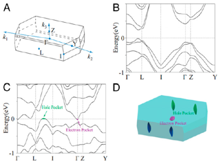 在前期工作基礎(chǔ)上,姚裕貴/李翔研究團(tuán)隊(duì)進(jìn)一步在國(guó)際先進(jìn)的極端高壓測(cè)量系統(tǒng)上開展實(shí)驗(yàn)研究工作,對(duì)Bi4Br4單晶的晶體結(jié)構(gòu)和電子結(jié)構(gòu)進(jìn)行了更加全面系統(tǒng)的研究。如圖1A所示,Bi4Br4在常壓下的穩(wěn)定相是α-Bi4Br4,具有各向異性的準(zhǔn)一維鏈結(jié)構(gòu)(空間群C2/m),其鏈內(nèi)化學(xué)鍵較強(qiáng),而鏈間范德華力較弱。因此壓力可以在不引入化學(xué)摻雜復(fù)雜性的情況下,顯著改變?chǔ)?Bi4Br4原子間的排列方式和電子結(jié)構(gòu),從而引發(fā)多種常壓下難以觀察到的新奇物態(tài)。例如,理論預(yù)測(cè)具有相同C2/m對(duì)稱性的另一種準(zhǔn)一維β-Bi4Br4相(圖1B),將在壓力下實(shí)現(xiàn)弱拓?fù)浣^緣體(WTI)-復(fù)合外爾半金屬(Weyl Semimetal)-強(qiáng)拓?fù)浣^緣體(STI)的轉(zhuǎn)變。此外,另一個(gè)有趣的問(wèn)題是:能否可以在高壓下實(shí)現(xiàn)Bi4Br4的超導(dǎo)電性,同時(shí)保持它的拓?fù)鋺B(tài)不變?為了從實(shí)驗(yàn)上解答這些問(wèn)題,他們首先生長(zhǎng)出了高質(zhì)量的α-Bi4Br4單晶,并在0-45 GPa的準(zhǔn)靜水壓范圍內(nèi)詳細(xì)測(cè)量了其電阻隨溫度和磁場(chǎng)的依賴關(guān)系。如圖2所示,他們?cè)?.0-3.8 GPa之間觀測(cè)到壓力引起的絕緣體-金屬轉(zhuǎn)變;理論計(jì)算表明,這是由于價(jià)帶和導(dǎo)帶穿過(guò)費(fèi)米能級(jí),形成許多小的空穴和電子口袋造成的。有意思的是,隨著壓力的進(jìn)一步增加,他們相繼觀察到兩個(gè)超導(dǎo)轉(zhuǎn)變(如圖3所示)。其中第一個(gè)出現(xiàn)在3.8 GPa,電阻在6.8 K附近急劇下降至0,該轉(zhuǎn)變溫度隨著磁場(chǎng)的增大而降低,并且高壓磁化率顯示出明顯的抗磁信號(hào)。這些結(jié)果說(shuō)明這是一個(gè)體相超導(dǎo)轉(zhuǎn)變。繼續(xù)增加壓力,第一個(gè)超導(dǎo)相的轉(zhuǎn)變溫度逐漸降低,直至12 GPa以上完全消失;另一方面,在5.5 GPa、9.0 K附近出現(xiàn)第二個(gè)超導(dǎo)轉(zhuǎn)變,其轉(zhuǎn)變溫度隨著壓力的增大而逐漸降低,但在45 GPa時(shí)仍然存在。為了闡明這些物性和結(jié)構(gòu)的關(guān)系,他們利用X射線衍射(XRD)分別測(cè)量了Bi4Br4單晶和多晶在高壓下的結(jié)構(gòu)(如圖4所示),發(fā)現(xiàn)在4.3 GPa時(shí)Bi4Br4保持單斜的α相結(jié)構(gòu),而在7.8 GPa時(shí)轉(zhuǎn)變?yōu)槿钡腜-1相?;谶@些結(jié)果,他們又計(jì)算了α-Bi4Br4在壓力下的能帶結(jié)構(gòu)(圖5),從中可以看出其拓?fù)湫栽?.3 GPa時(shí)仍然受到C2旋轉(zhuǎn)對(duì)稱性的保護(hù),表明第一個(gè)超導(dǎo)相可能與受旋轉(zhuǎn)對(duì)稱性保護(hù)的拓?fù)湫怨泊?;而第二個(gè)超導(dǎo)相的出現(xiàn)則與7.8 GPa發(fā)生的結(jié)構(gòu)相變有關(guān)。上述結(jié)果對(duì)全面理解壓力調(diào)控拓?fù)洳牧系木w結(jié)構(gòu)和電子特性具有重要意義。