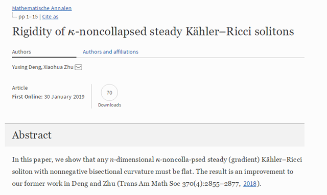 日前,北京理工大學(xué)數(shù)學(xué)與統(tǒng)計學(xué)院鄧宇星副研究員在國際頂級學(xué)術(shù)期刊《Mathematische Annalen》在線發(fā)表題為“Rigidity of k-noncollpased steady Kaehler-Ricci solitons”的研究論文。該論文研究了具有非負(fù)雙全純截面曲率的體積非塌穩(wěn)態(tài)型縮凱勒-里奇孤立子(steady Kaehler-Ricci solitons)的剛性,證明了具有非負(fù)雙全純截面曲率的體積非塌縮凱勒-里奇孤立子必然是平凡的。作為該定理的應(yīng)用,論文還證明了長時間存在的凱勒-里奇流必然是體積極大增長的度量所生成的凱勒-里奇流。