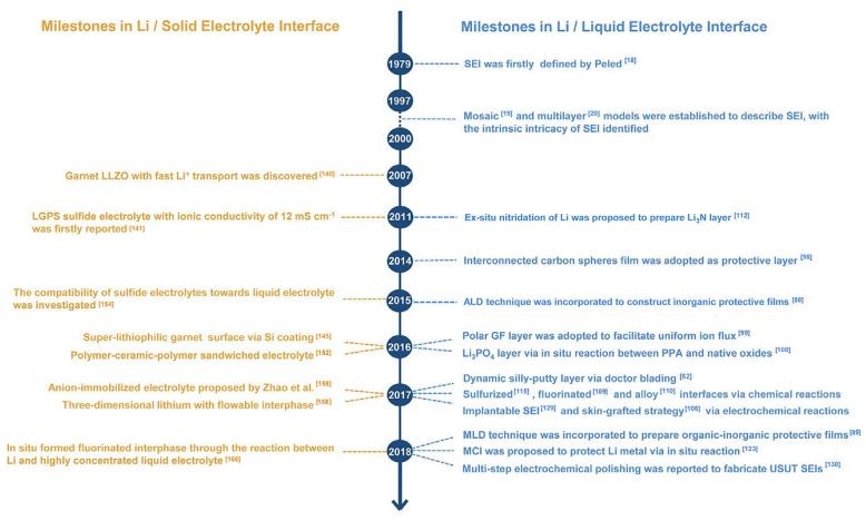 圖2 鋰金屬負(fù)極與液態(tài)(固態(tài))電解質(zhì)之間界面工程的發(fā)展史