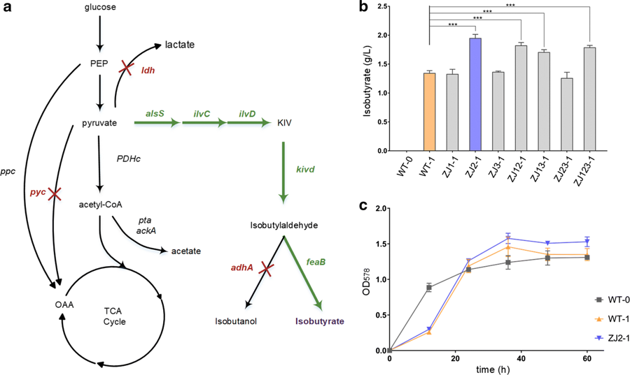 CRISPR/Cpf1是繼CRISPR/Cas9之后被開發(fā)出來的基因組編輯系統(tǒng)。與CRISPR/Cas9相比,CRISPR/Cpf1脫靶率更低且所需的核酸酶和RNA分子更小,因此在基因組編輯領(lǐng)域具有巨大的應(yīng)用潛力。然而,編輯效率相對(duì)較低限制了CRISPR/Cpf1基因編輯系統(tǒng)的應(yīng)用。谷氨酸棒桿菌是一種重要的工業(yè)生產(chǎn)菌株,此前,研究者利用CRISPR/Cpf1在谷氨酸棒桿菌中進(jìn)行基因組編輯的效率低于15%,且無法利用線性DNA作為修復(fù)模板。因此,該課題組針對(duì)谷氨酸棒桿菌的基因組編輯對(duì)CRISPR/Cpf1系統(tǒng)進(jìn)行了系統(tǒng)的優(yōu)化,優(yōu)化參數(shù)包括PAM序列、間隔序列的長(zhǎng)度、修復(fù)模板的類型。利用優(yōu)化后的CRISPR/Cpf1系統(tǒng)在谷氨酸棒桿菌中進(jìn)行基因組編輯的效率顯著提高,且可以利用線性DNA作為修復(fù)模板。隨后,該課題組利用優(yōu)化后的CRISPR/Cpf1系統(tǒng)對(duì)野生型谷氨酸棒桿菌進(jìn)行遺傳改造,通過敲除基因 pyc 、 ldh 和 adhA 成功地提高了異丁酸的產(chǎn)量(圖2)。相關(guān)成果發(fā)表于《Microbial Cell Factories》,原文鏈接:https://doi.org/10.1186/s12934-019-1109-x