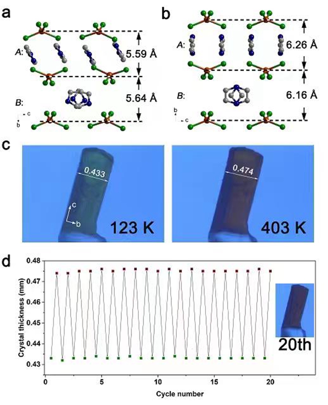 熱膨脹是材料的一種基本物理性質(zhì)。典型的固態(tài)材料熱膨脹系數(shù) (α) 小于20 × 10?6 K?1,但一些具有特殊結(jié)構(gòu)的固體材料可以表現(xiàn)出異常的各向異性的巨熱膨脹 (α > 100 × 10?6 K?1) 和負(fù)熱膨脹 (α < 0 × 10?6 K?1) 性質(zhì)。這種異常的熱膨脹行為,不僅有助于促進(jìn)研究者對于材料晶格作用的認(rèn)識,同時(shí)在設(shè)計(jì)熱控高精度微致動(dòng)器以及普通材料熱膨脹補(bǔ)償?shù)雀叨酥圃旆矫婢哂袕V闊的應(yīng)用前景。但由于受晶格空間位阻以及分子間作用力阻撓,相關(guān)材料的設(shè)計(jì)合成一直是分子材料領(lǐng)域面臨的巨大挑戰(zhàn)。