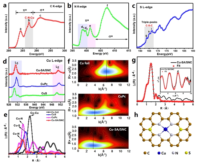 氧還原反應(yīng)(ORR)中催化活性的調(diào)節(jié)對(duì)金屬-空氣電池和其他相關(guān)能量轉(zhuǎn)換材料的開(kāi)發(fā)具有重要意義。金屬嵌入雜原子摻雜碳基催化劑由于其高電導(dǎo)率和可調(diào)節(jié)的電子結(jié)構(gòu),作為有希望的ORR催化劑引起了越來(lái)越多的關(guān)注。納米界面工程由于電荷轉(zhuǎn)移和化學(xué)鍵的強(qiáng)協(xié)同作用,被認(rèn)為是修改碳基復(fù)合材料ORR性能的有效途徑。陳文星等提出了一種原子界面策略來(lái)構(gòu)建顯著提高ORR活性的單原子Cu催化劑,其中Cu原子錨定在硫和氮改性的碳載體(Cu-SA / SNC)上。該催化劑在堿性介質(zhì)中具有優(yōu)異的ORR性能(E1/2= 0.893 V vs. RHE),遠(yuǎn)優(yōu)于同類催化劑。此外,基于同步輻射的X射線吸收精細(xì)結(jié)構(gòu)(XAFS)研究以及密度泛函理論(DFT)計(jì)算表明,孤立的鍵長(zhǎng)收縮的低價(jià)Cu (+1)-N4-C8S2原子界面部分為ORR過(guò)程的活性位點(diǎn),原子界面處的Cu和載體產(chǎn)生協(xié)同作用,通過(guò)調(diào)節(jié)中間吸附的反應(yīng)自由能,有效提高ORR效率。該原子界面概念可以為先進(jìn)的氧電極材料的合理設(shè)計(jì)提供新的方法,并為提高其催化性能提供新的可能性。