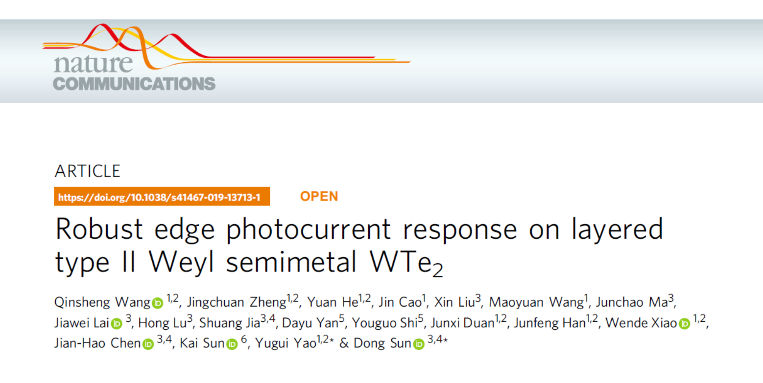 近日,北京理工大學(xué)物理學(xué)院姚裕貴教授、王欽生特別副研究員及團(tuán)隊(duì)成員,同北京大學(xué)量子材料中心孫棟研究員等合作者,在第二類外爾半金屬材料WTe2光電響應(yīng)研究方面取得重要進(jìn)展。他們利用掃描光電流譜方法對(duì)第二類外爾半金屬材料WTe2光電響應(yīng)進(jìn)行了系統(tǒng)的研究,發(fā)現(xiàn)在該材料邊界處具有反常的光電流響應(yīng)(圖1),并且邊界對(duì)稱性的高低決定了該反常光電流響應(yīng)的有無(wú)。該工作提出了利用材料低對(duì)稱性邊界的晶體場(chǎng)作為光生電子-空穴對(duì)分離的有效手段,并討論了拓?fù)溥吘墤B(tài)對(duì)于光電響應(yīng)的可能影響,為拓?fù)浒虢饘俨牧显诠怆娞綔y(cè)等方面的應(yīng)用提供了新的思路。相關(guān)成果最近發(fā)表在Nature Communications上。