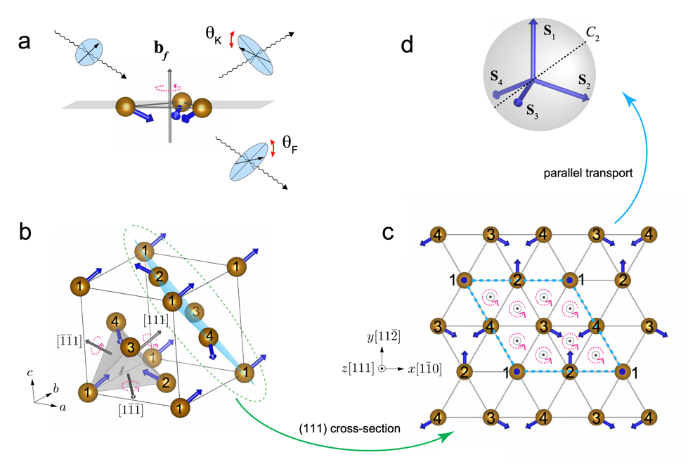 圖1 (a)標量自旋手性誘導(dǎo)的拓撲磁光效應(yīng)。(b)三維面心立方晶格中的非共面反鐵磁自旋結(jié)構(gòu)。(c)二維三角晶格中的非共面反鐵磁自旋結(jié)構(gòu)。(d)四個非共面的自旋經(jīng)過平行輸運后形成的單位球。