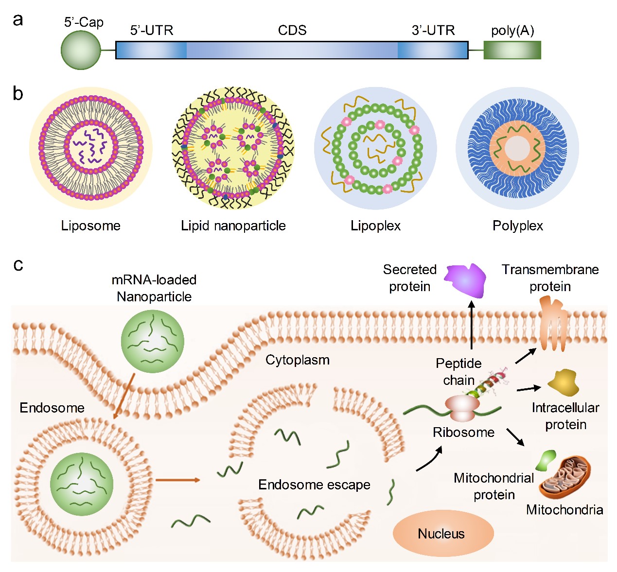 圖1 mRNA療法示意圖。(a)體外轉(zhuǎn)錄mRNA的結(jié)構(gòu);(b)mRNA遞送載體示意圖;(c)mRNA入胞表達(dá)目的蛋白示意圖