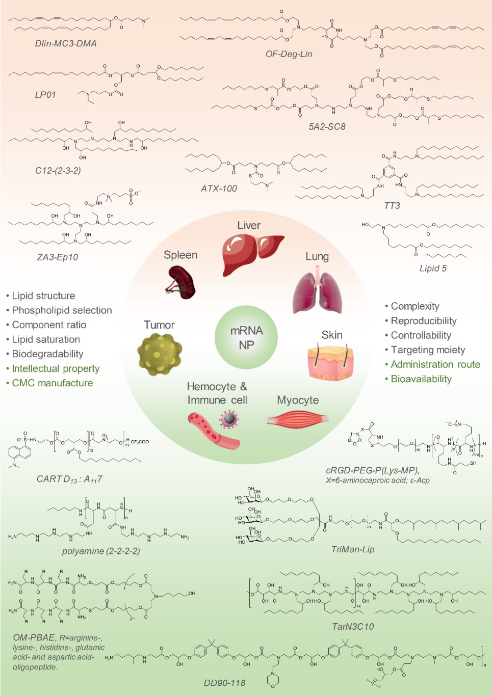圖2 代表性mRNA遞送載體的結(jié)構(gòu)與目標(biāo)組織