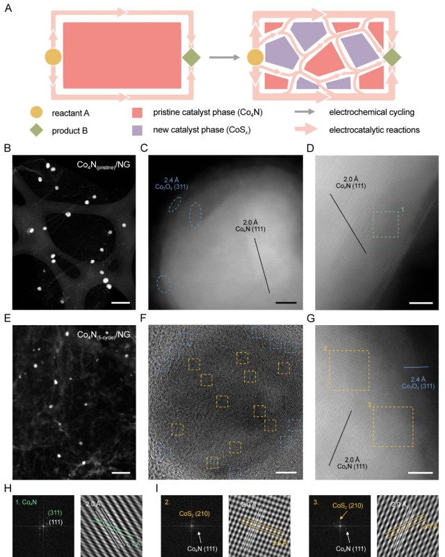 圖1. 預(yù)催化劑的原位電化學相演變的示意圖和對應(yīng)的電子顯微圖像。富金屬化合物作為預(yù)催化劑(以Co4N為例)在工作電池中經(jīng)歷原位“馬賽克化”相演變的過程示意圖。