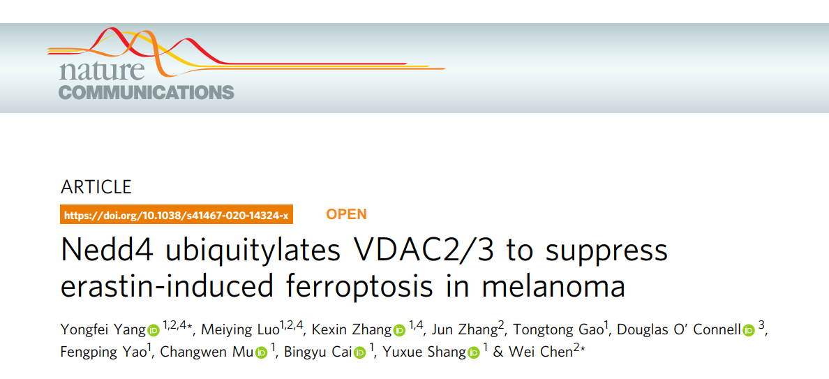 Yongfei Yang, Meiying Luo, Kexin Zhang, Jun Zhang, Tongtong Gao, Douglas O’ Connell, Fengping Yao, Changwen Mu, Bingyu Cai, Yuxue Shang & Wei Chen. Nedd4 ubiquitylates VDAC2/3 to suppress erastin-induced ferroptosis in melanoma. Nature Communications, 11, 433 (2020).