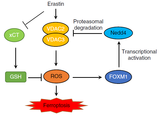 本研究發(fā)現(xiàn)erastin通過誘導(dǎo)ROS應(yīng)答轉(zhuǎn)錄因子 FOXM1 激活神經(jīng)元前體細胞表達發(fā)育下調(diào) 4(Nedd4)的表達。Nedd4是真核生物 HECT 結(jié)構(gòu)域 E3 連接酶家族的重要成員,在進化過程中保持保守性。Nedd4 通過其WW結(jié)構(gòu)域與VDAC2/3的PPxY序列結(jié)合并促進VDAC2/3降解,從而降低了癌細胞對 erastin 的敏感性。通過抑制Nedd4和FOXM1的表達,以減少VDAC2/3蛋白質(zhì)降解的方法,可以增加癌細胞對erastin的敏感性。該項研究闡明了一種基于FOXM1-Nedd4-VDAC2/3負反饋回路,揭示了腫瘤細胞如何適應(yīng)新的小分子藥物并維持細胞內(nèi)穩(wěn)態(tài)的分子機制,并提示了以Nedd4作為靶標(biāo)治療,通過細胞鐵死亡治療腫瘤的新思路。