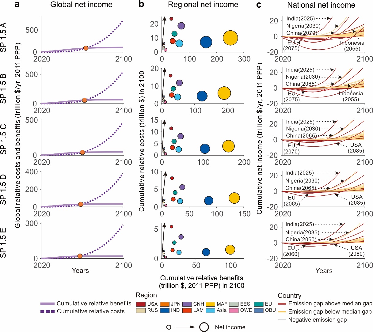 研究團隊基于模型結(jié)果,編制了后巴黎協(xié)定時代實現(xiàn)溫控目標的國家自主減排貢獻改進的全球方案;預(yù)測了不同方案下各國扭虧為盈的時間;量化了實現(xiàn)扭虧為盈的前期投資,為NDC目標更新、全球盤點以及國家間資金和技術(shù)轉(zhuǎn)移提供了科學依據(jù)。