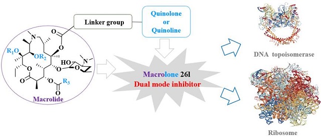 耐藥菌感染已成為全球人類健康的主要威脅之一。但抗生素面臨著一上市就迅速產(chǎn)生耐藥性的研發(fā)困境。大環(huán)內(nèi)酯類抗生素在細(xì)菌核糖體狹窄的新生肽通道親和從而阻礙蛋白質(zhì)輸出。喹喏酮作用于拓?fù)洚悩?gòu)酶,形成酶-DNA-喹喏酮三體復(fù)合物,干擾DNA復(fù)制過程?;陔s合抗生素的理念——將兩個(gè)作用機(jī)理不同的分子共價(jià)連接,獲得具有雙重作用模式的雜合物,以克服其中一種或兩種藥物的耐藥機(jī)制,重獲抗菌活性,并且大幅降低微生物耐藥性的產(chǎn)生幾率。本研究的難點(diǎn)是核糖體和拓?fù)洚悩?gòu)酶為兩個(gè)迥異的靶標(biāo),對(duì)配體的結(jié)構(gòu)要求差異較大,雜合物很難實(shí)現(xiàn)同時(shí)作用這兩個(gè)靶標(biāo)。梁建華課題組以阿奇霉素為先導(dǎo),將喹諾酮類化合物以?;姆绞浇Y(jié)合于阿奇霉素C-6位上,經(jīng)過篩選,發(fā)現(xiàn)阿奇霉素與環(huán)丙沙星/加替沙星的雜合物體可以通過類似于氟喹諾酮的方式——使促旋酶中毒來抑制細(xì)菌DNA 的復(fù)制,從而提高化合物對(duì)高水平耐藥菌的抗菌活性。研究采用了DNA超螺旋抑制實(shí)驗(yàn)、DNA裂解實(shí)驗(yàn)以及分子對(duì)接和全細(xì)胞水平生長(zhǎng)抑制等實(shí)驗(yàn)驗(yàn)證,結(jié)果具有一致性。這種既可抑制蛋白合成又可抑制DNA復(fù)制的雙重作用模式為未來合理設(shè)計(jì)抗耐藥菌的新型抗生素奠定了基礎(chǔ)。