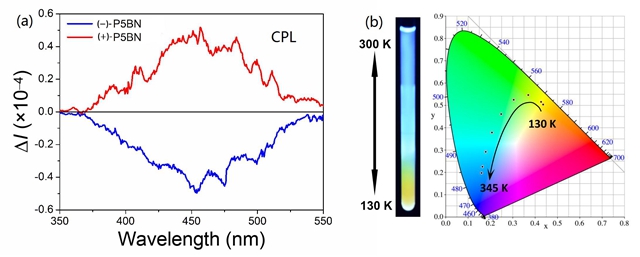 圖2 (a) P5BN在固態(tài)CPL譜圖;(b) P5BN熱響應(yīng)熒光變色現(xiàn)象。