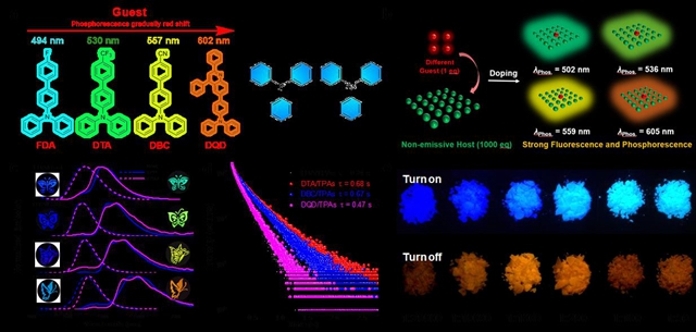 編輯:劉曉雪 審核:金海波 閱讀次數(shù):室溫磷光(RTP)材料具有長壽命、持久發(fā)光的特性,適用于光學記錄、防偽等,同時又可以應用于高對比度背景獨立生物成像。但是傳統(tǒng)的RTP材料以無機貴金屬摻雜為主,具有不可持續(xù)生物相容性低等缺點。所以開辟有機RTP材料具有重要的實際意義,近年來通過將客體材料嵌入到剛性或晶體基質(zhì)中,制備新的RTP已經(jīng)有報道。然而,傳統(tǒng)的理論認為基體的剛性結構限制客體分子的分子運動,從而提高其輻射躍遷速率促進其磷光發(fā)射;此外,剛性宿主有利于避免與濕度和氧氣對三線態(tài)激子的猝滅。隨著科技的發(fā)展,研究者逐漸意識到剛性主體分子在摻雜材料的發(fā)光過程中不僅僅起到物理性機械限制的作用,兩者發(fā)生的能量協(xié)同作用也是摻雜材料具有RTP性質(zhì)的重要因素。