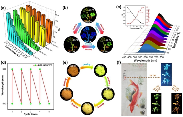 圖2.(a)主客體材料在15-65 oC溫度范圍內(nèi)的原位磷光強度變化。(b)在不同溫度下去除激發(fā)源之前(中間)和之后的花朵照片。DTA-DQD/TPP摻雜材料(c)在不同溫度下的磷光波長和強度;(d)在四個循環(huán)中原位磷光波長變化;(e)在不同溫度下的磷光顏色變化;(f)在書法和藝術品防偽中的應用。