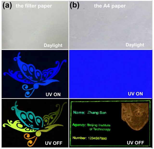 此外,作者又探索了摻雜材料在防偽打印方面的應用。作者首先的把主體化合物附著在商業(yè)性A4紙以及不具有熒光發(fā)射的普通紙上,再把客體分子溶解在實驗室常用溶劑如二氯甲烷中以用作油墨。在紙張上可以進行手寫繪畫或者進行噴墨打印,由于商業(yè)性A4紙具有很強的熒光背景,因此在日光燈和紫外光照射下均不能得到相應的信息,只有在去除紫外光照射后的幾秒內(nèi)呈現(xiàn)動態(tài)的顏色變化。所以該油墨打印出的證件具有極大的防竊取性。