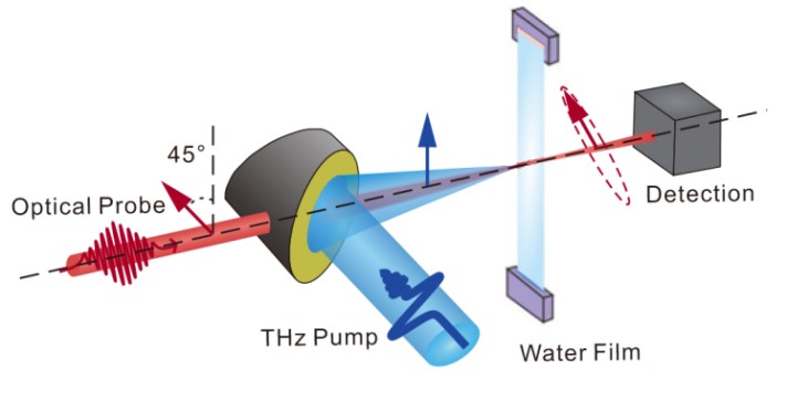 近日,北京理工大學(xué)光電學(xué)院趙躍進(jìn)教授課題組同首都師范大學(xué)張亮亮研究員課題組合作,在太赫茲波探測液態(tài)水中氫鍵運(yùn)動(dòng)研究方面取得新進(jìn)展。他們發(fā)現(xiàn)在自由下落的水膜上施加超強(qiáng)的寬帶太赫茲脈沖會(huì)引起折射率的可測量變化,這與液態(tài)水中共振激發(fā)的氫鍵振動(dòng)有關(guān)。該研究實(shí)現(xiàn)了在亞皮秒時(shí)間分辨率下對(duì)液態(tài)水中超快的氫鍵動(dòng)力學(xué)演化過程的觀察。該研究成果以"Ultrafast Hydrogen-Bond Dynamics of Liquid Water revealed by Terahertz-induced Transient Birefringence" 為題在線發(fā)表在國際光學(xué)頂尖期刊Light: Science & Applications上。