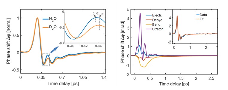 圖2 a水和重水的太赫茲克爾效應(yīng)的時(shí)域特征。b超快時(shí)域演化的理論模擬