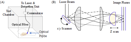 圖1. (A) 光學(xué)成像中的可自由活動(dòng)的小動(dòng)物,微型光纖探頭固定于其頭部。(b)微型探頭內(nèi)部的三維掃描光路。