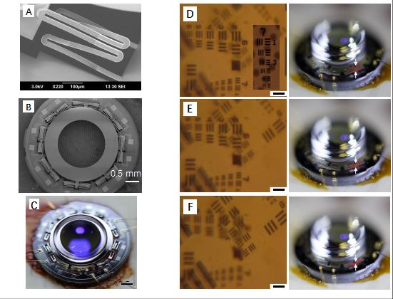 圖2. (A) 電熱MEMS執(zhí)行器SEM;(B)MEMS微驅(qū)動(dòng)平臺(tái)芯片SEM;(C)MEMS微透鏡照片;(D-F)MEMS微透鏡在不同電壓下的USAF分辨率卡疊層顯微圖片。