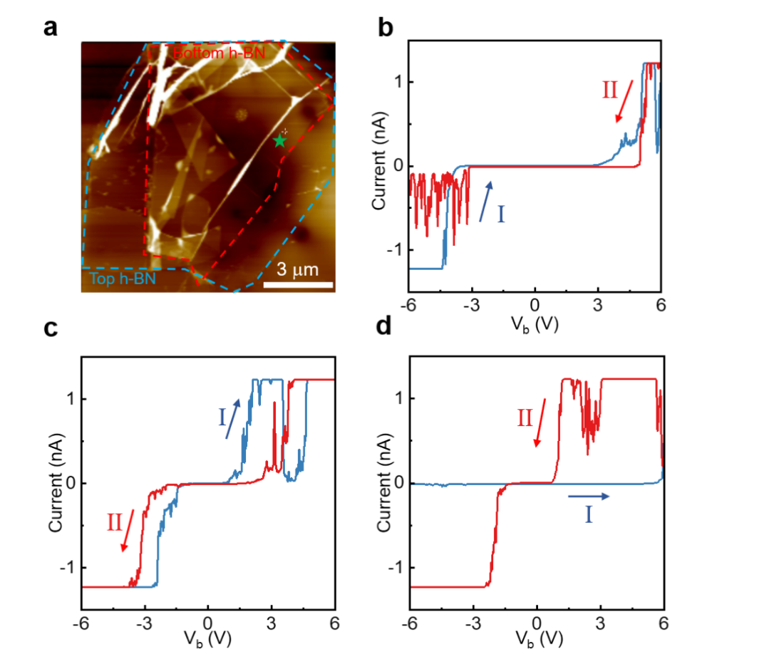 圖5展示了滑移憶阻器的C-AFM圖。圖a展示了PS-BN在石墨烯薄片上的原子力顯微鏡圖(上下兩層h-BN均以虛線標(biāo)出)。圖b-d展示了PS-BN 在同一點(diǎn)上的I-V 曲線和憶阻行為(圖a中綠色星形標(biāo)記處)。