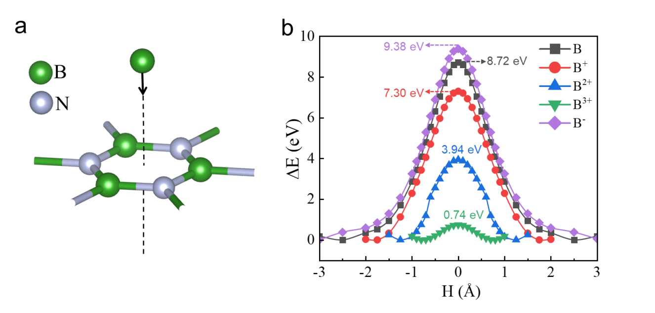 圖4展示了原子/離子穿過 h-BN 層所需的遷移能。圖a展示了h-BN 層的原子結(jié)構(gòu),B 原子/離子位于六邊形中心上方。B 原子/離子沿黑色虛線移動(dòng),穿過 h-BN 層。圖b展示了系統(tǒng)能量(ΔE)與 H(B 原子/離子距離 h-BN 層的高度)的函數(shù)關(guān)系。分別展示了中性 B 原子(黑線)、帶一個(gè)正電荷的 B+(紅線)、帶兩個(gè)正電荷的 B2+(藍(lán)線)、帶三個(gè)正電荷的 B3+(綠線)和帶一個(gè)負(fù)電荷的 B-(紫線)的能量勢(shì)壘。