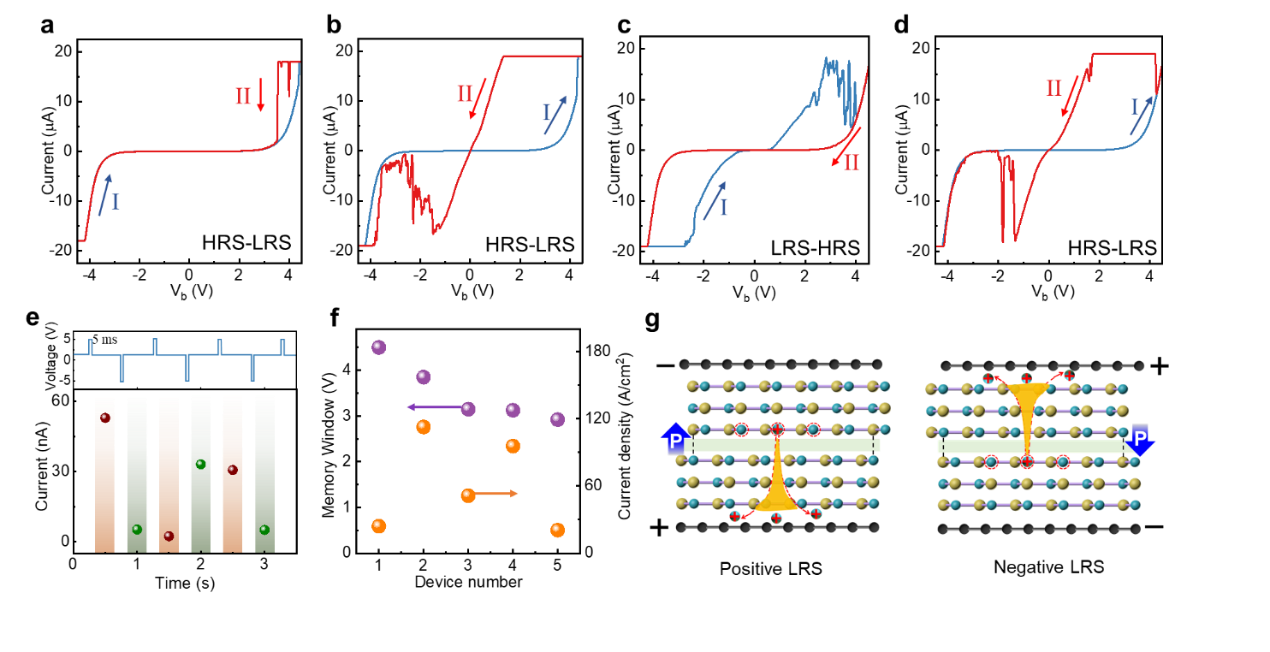 圖3展示了滑移憶阻器中的記憶窗口。圖a-d展示了PS-BN中HRS和LRS之間的切換,顯示了可逆的大記憶窗口。圖c展示了器件可以在電場的同一方向上從LRS切換到HRS,這與基于金屬電極的憶阻器不同。圖e展示了在5ms內(nèi)分別用 5V和 -5V的脈沖電壓對(duì)滑移憶阻器進(jìn)行編程和擦除。圖f展示了幾個(gè)器件的記憶窗口大小和電流密度的匯總。圖g展示了帶正電荷的硼離子在兩個(gè)界面極化運(yùn)動(dòng)時(shí)形成導(dǎo)電絲的示意圖。