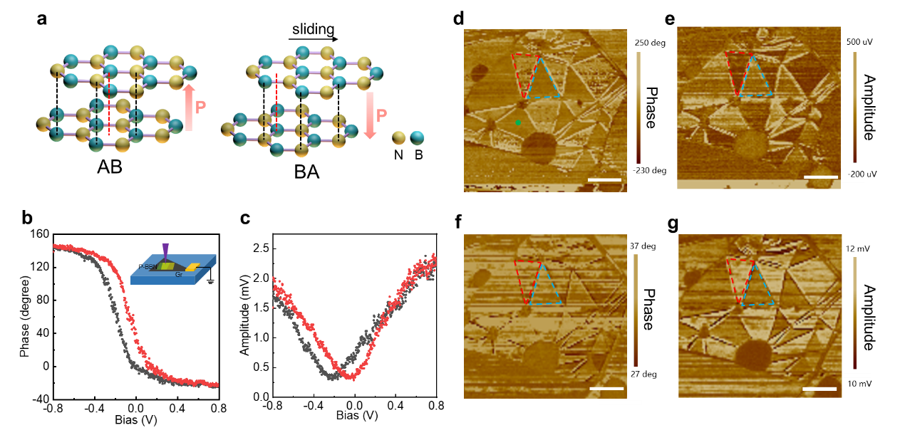 圖1展示的 PS-BN 的可切換鐵電疇。圖a展示了具有 AB 和 BA 堆疊順序的 PS-BN 結(jié)構(gòu)圖,其中層間極化由硼(藍(lán)色)和氮(黃色)原子的排列產(chǎn)生。圖c和圖b展示了垂直 PFM 相位和振幅滯后回線分別與所施加的尖端偏壓成函數(shù)關(guān)系。圖d和圖e 展示了在少層石墨烯上的 PS-BN的PFM 振幅和相位映射,顯示出明顯的 AB 和 BA 鐵電疇。圖f和圖g 展示了PS-BN 在施加 1 V 直流電壓時(shí)的PFM 相位和振幅圖像,展示了可切換的鐵電疇。