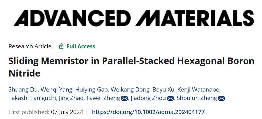 鑒于此,北京理工大學(xué)鄭守君副教授、周家東教授、鄭法偉教授共同合作在Advanced Materials在線發(fā)表“Sliding memristor in parallel-stacked hexagonal boron nitride”的研究成果(Adv. Mater. , 240417, (2024))。研究者通過利用石墨烯/平行堆疊六方氮化硼(PS-BN)/石墨烯隧穿器件設(shè)計(jì)了一種滑移憶阻器,它在界面極化的調(diào)制下表現(xiàn)出可調(diào)的憶阻行為。我們的滑移憶阻器的憶阻行為歸因于帶正電荷的硼離子的層間遷移、聚集和導(dǎo)電絲(CFs)的形成,這也得到了理論計(jì)算的支持。我們提出的基于 PS-BN 隧穿器件的滑移憶阻器,可以通過極化和施加電場成功地操縱電阻狀態(tài)?;茟涀杵鞣€(wěn)定的記憶窗口和憶阻行為表明,可以通過隧穿電流探索滑移鐵電性,并將其集成到憶阻器中。這一發(fā)現(xiàn)不僅為表征滑移鐵電材料提供了一種新方法,還為信息存儲(chǔ)和神經(jīng)形態(tài)計(jì)算中的憶阻器應(yīng)用提供了可能。