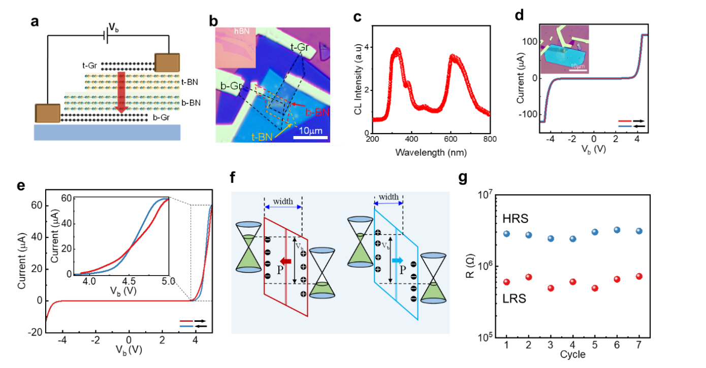 圖2展示了滑移憶阻器的隧穿電流特性。圖a展示了由石墨烯/PS-BN/石墨烯結(jié)構(gòu)組成的滑移憶阻器示意圖。圖b展示了滑移憶阻器的光學(xué)照片。圖c展示了h-BN 的陰極熒光光譜,在 350 nm和 630 nm波長附近顯示出多個(gè)陰極熒光峰。圖d展示了石墨烯/h-BN/石墨烯隧穿器件的 I-V 曲線,沒有滯后現(xiàn)象。圖e展示了滑移憶阻器的 I-V 曲線,顯示在4 V左右存在穩(wěn)定的回滯。圖f展示了具有兩種極化態(tài) PS-BN 的滑移憶阻器能帶圖,顯示了可調(diào)的勢(shì)壘高度和寬度。圖g展示了在寫入電壓為5 V和擦除電壓為-5 V時(shí),滑移憶阻器的耐久性。
