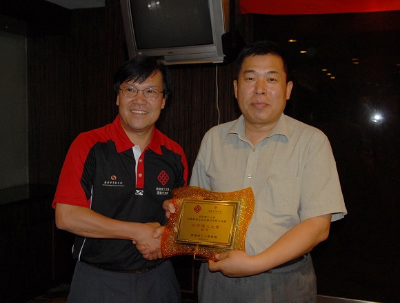 早些時候,剛剛完成在京活動,即將返港的香港理工大學唐偉章校長也趕到我校,與考察交流團師生會面。我校港澳臺辦公室王慶林主任、體育部孟光云副主任代表學校接待了唐偉章校長。王慶林主任向唐偉章校長贈送了我校足球隊隊服。