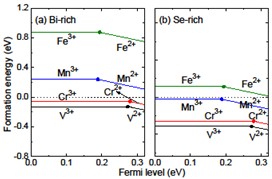 圖2. V, Cr, Mn 和Fe摻雜Bi2Se3時不同穩(wěn)定價態(tài)的形成能隨體系費米能級的變化。(a)和(b)分別表示富鉍生長和富硒生長兩種不同的制備條件。