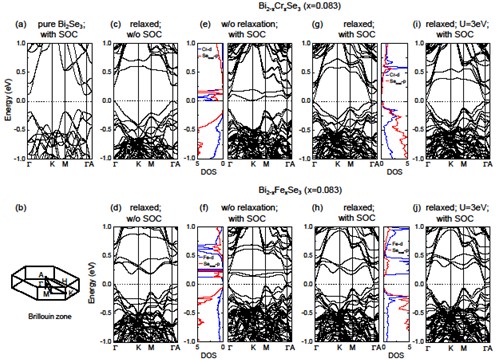 圖3. 2×2×1 Bi2Se3超胞(a)考慮自旋軌道耦合下的能帶圖及其(b)布里淵區(qū)和高對稱點。(c)-(j) Cr和Fe摻雜Bi2Se3體系不同條件下的能帶結(jié)構(gòu)。