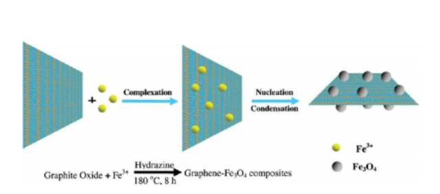 石墨烯有著很好的二維結(jié)構(gòu),出眾的熱學(xué)穩(wěn)定性,良好的導(dǎo)電性和延展性,使得其在在材料科學(xué)中受到極大關(guān)注。學(xué)者認(rèn)為,石墨烯片層結(jié)構(gòu)在納米科學(xué)中有著廣泛應(yīng)用的潛力,因此可作為一個(gè)良好的載體來(lái)支持和固定功能性的物質(zhì)。特別是在當(dāng)前能源問題日益凸顯的今天,人們努力尋找高效儲(chǔ)能電極材料。有許多具有電化學(xué)活性的金屬及氧化物(如錫,三氧化二鐵,四氧化三鐵等)已被廣泛用于鋰離子電池負(fù)極材料。但是小尺寸的納米粒子在鋰離子充放電過(guò)程中,常常存在顆粒團(tuán)聚的現(xiàn)象,這極大地?fù)p害了鋰離子電池性能,因此將納米粒子與石墨烯結(jié)合起來(lái),石墨烯一方面可增加導(dǎo)電性,另一方面可避免納米粒子的團(tuán)聚,從而提高電池性能。