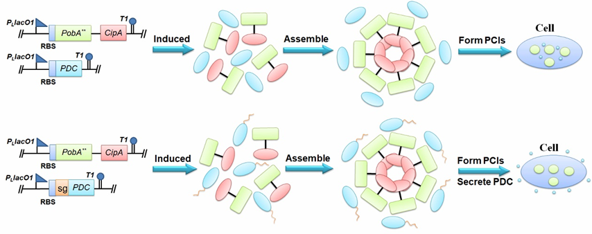 鄰苯三酚是一種具有多種生理功能和藥物價(jià)值的酚類化合物。申請(qǐng)人在大腸桿菌中成功構(gòu)建了以葡萄糖為初始碳源的鄰苯三酚非天然生物合成途徑。在生物合成過(guò)程中,關(guān)鍵前體物4-羥基苯甲酸先被Y385F/T294A PobA催化生成3,4-二羥基苯甲酸,3,4-二羥基苯甲酸再被Y385F/T294A PobA進(jìn)一步催化生成沒(méi)食子酸,隨后脫羧酶PDC對(duì)沒(méi)食子酸進(jìn)行脫羧反應(yīng)生成鄰苯三酚。脫羧酶PDC的底物多樣性導(dǎo)致其也會(huì)對(duì)中間產(chǎn)物3,4-二羥基苯甲酸進(jìn)行脫羧反應(yīng),進(jìn)而生成副產(chǎn)物兒茶酚。在組裝完整途徑并轉(zhuǎn)化到宿主菌中發(fā)酵后發(fā)現(xiàn)鄰苯三酚產(chǎn)量很低,副產(chǎn)物兒茶酚產(chǎn)量很高,說(shuō)明Y385F/T294A PobA催化3,4-二羥基苯甲酸到?jīng)]食子酸的過(guò)程不夠迅速,導(dǎo)致大量的碳源流向了副產(chǎn)物兒茶酚的生產(chǎn)途徑。于是,申請(qǐng)人借鑒了CipA的自組裝特性,將CipA與合成途徑中的關(guān)鍵限速酶Y385F/T294A PobA融合形成融合蛋白(Y385F/T294A PobA-CipA或CipA-Y385F/T294A PobA),隨后融合蛋白在胞內(nèi)聚集形成包涵體(圖3)。聚集后的Y385F/T294A PobA加快了4-羥基苯甲酸到?jīng)]食子酸的兩步轉(zhuǎn)化,降低了脫羧酶PDC對(duì)3,4-二羥基苯甲酸的催化,提高了目標(biāo)產(chǎn)物鄰苯三酚的產(chǎn)量。相關(guān)研究成果發(fā)表在 Applied Microbiology and Biotechnology (影響因子:5.0002)雜志上(CipA-mediating enzyme self-assembly to enhance the biosynthesis of pyrogallol in Escherichia coli .)。陳振婭副研究員為通訊作者。