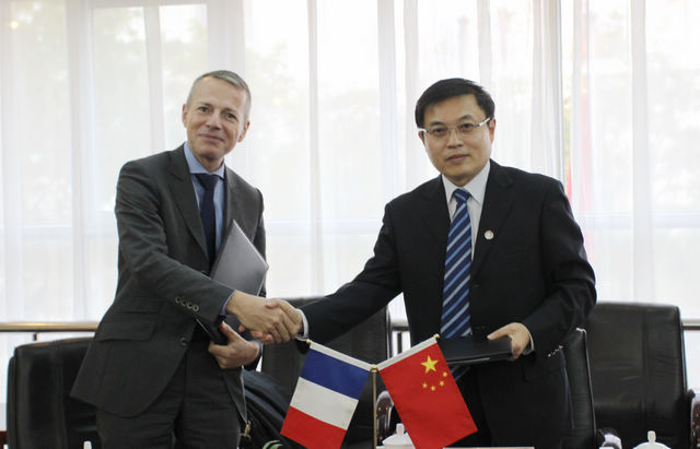 會(huì)談過(guò)后,胡海巖校長(zhǎng)和Vidal校長(zhǎng)簽署了《北京理工大學(xué)和法國(guó)南特經(jīng)濟(jì)管理學(xué)院校際合作備忘錄》。