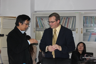 研討會前譚華春副教授和Dr.Sayer交流 趙亞男副教授主持研討會