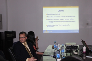 在學術交流中,James R. Sayer 對密歇根大學的研究歷史以及他所在的交通運輸研究所的研究內容做介紹;Dr. Jim Sayer介紹了他作為主任的人因工程研究中心的在研課題,主要包括交通事故的統(tǒng)計分析、Integrated Vehicle-Based Safety Systems (IVBSS) 和The Connected Vehicle Safety Pilot Program等,視頻演示了在行車過程中不同因素對于行車安全的影響。