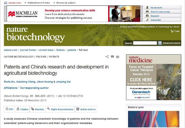 日前,北京理工大學(xué)管理與經(jīng)濟(jì)學(xué)院胡瑞法教授、蔡金陽博士與中科院農(nóng)業(yè)政策研究中心黃季焜教授、王曉兵副教授合作撰寫的論文《Patents and China's research and development in agricultural biotechnology(專利和中國農(nóng)業(yè)轉(zhuǎn)基因生物技術(shù)研究)》被國際著名學(xué)術(shù)期刊《Nature》子刊《Nature Biotechnology》接收并發(fā)表。這是作者繼去年在Nature Biotechnology上連續(xù)發(fā)表了兩篇論文之后,第三次在該刊發(fā)表論文。