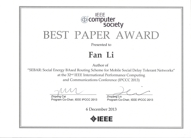 2013年12月在美國圣地亞哥舉行的第32屆IEEE國際性能計算和通信會議(IEEE International Performance, Computing and Communications Conference, IEEE IPCCC 2013)上,計算機(jī)學(xué)院李凡副教授及其團(tuán)隊的論文' SEBAR: Social Energy BAsed Routing Scheme for Mobile Social Delay Tolerant Networks '在126篇投稿中獲得本次會議唯一最佳論文獎。此項榮譽是李凡老師及其研究團(tuán)隊長期努力的結(jié)果,是對該團(tuán)隊研究與學(xué)術(shù)水平的肯定。