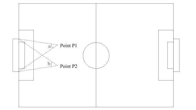 根據對球門威脅的不同,和足球比賽的規(guī)則,可以將球場劃分多個區(qū)域。場地劃分主要是根據球所在的位置進行的。而場地的分塊線,主要是根據球的射門角作為主要依據的。如圖1所示,假設P點和p1點為門前任意一點。當a=b時,P點和P1對門的威脅程度相同。