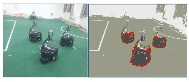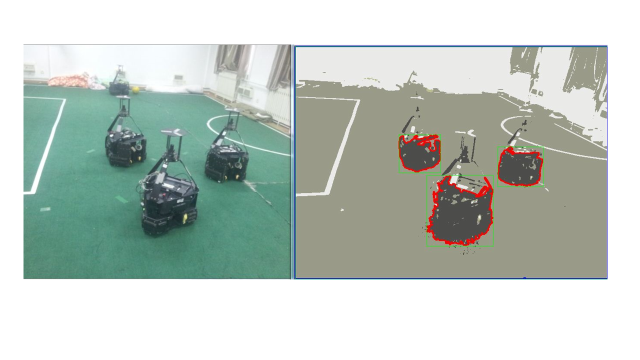中型組機器人足球比賽的對抗性極強,機器的移動速度極快,因此對機器人的反應能力有很大的要求。對守門員來說,其應對的是對方的高速射門,所以球定位的速度及準確度要求尤為嚴格。但是限于機器搭載的計算機的處理能力,難以達到這樣實時處理圖像的要求。為解決此問題我們提出了視覺自適應系統(tǒng)的解決方案。該系統(tǒng)以人為事先預定的知識為依據,然后由機器對環(huán)境逐步自學習、自適應,表現(xiàn)為越來越準確的識別效果。同時為了降低所需要處理數(shù)據的空間復雜度,視覺系統(tǒng)將原有的全局搜索變?yōu)榫植扛?,使用粒子濾波算法,建立物體特征的離散模型,并增加中值濾波來對所記錄的物體特征進行更新以達到對物體的特征跟蹤和學習的同步。同時處理的數(shù)據也由原本的圖像矩陣,減少為100到200的特征點的權值和坐標分布。最后再輔助以霍夫變換等圖像處理方法,實現(xiàn)對球、障礙物、場線的快速識別,使機器可以實時掌握賽場信息。該系統(tǒng)識別效果如圖4所示。