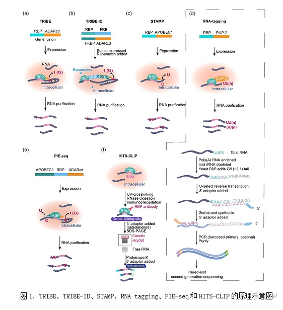 RNA結(jié)合蛋白(RNA-binding proteins,RBPs)是生物體內(nèi)強(qiáng)有力的多功能調(diào)節(jié)因子,通過在多個(gè)水平上調(diào)節(jié)基因表達(dá),在生物體發(fā)育、代謝和各種疾病中發(fā)揮重要作用。對RBP功能深入研究的需求,推動了RBP-RNA相互作用檢測方法的快速發(fā)展。近年來,將RNA修飾酶(RNA modification enzymes,RME)與感興趣的RBP融合的檢測方法開發(fā)成為一個(gè)熱門研究方向。該文章綜述了包括作用于RNA的腺嘌呤脫氨基酶ADAR、末端核苷酸轉(zhuǎn)移酶TENT和激活誘導(dǎo)的胞嘧啶脫氨酶/載脂蛋白B mRNA編輯酶催化多肽樣(AID/APOBEC)蛋白家族脫氨酶在內(nèi)的,RNA修飾酶的生物學(xué)功能、生物化學(xué)活性和來自于酶自身與其結(jié)構(gòu)域和伴侶蛋白的底物特異性。同時(shí),討論了RNA修飾酶活性篩選系統(tǒng),以及具有工程酶活性的RNA修飾酶突變。此外,文章提供了基于RNA修飾酶和基于交聯(lián)和免疫純化(CLIP)的RBP靶標(biāo)檢測策略的基本原理、優(yōu)缺點(diǎn)和應(yīng)用的系統(tǒng)概述,包括基于A-G的RNA編輯酶鑒定RNA結(jié)合蛋白靶標(biāo)的TRIBE(Targets of RNA-binding proteins Identified By Editing)、基于RNA加尾酶的方法RNA Tagging、C-U的RNA編輯酶APOBEC1介導(dǎo)的編輯靶標(biāo)分析技術(shù)STAMP(Surveying Targets by APOBEC-Mediated Profiling)、CLIP-seq及其衍生技術(shù) (圖1)。