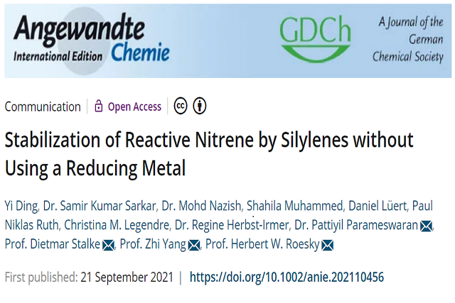 近日,北京理工大學化學與化工學院楊智教授與合作者在氮卡賓領域取得重要進展。相關成果以“Stabilization of Reactive Nitrene by Silylenes without using a Reducing Metal”為題,在國際化學頂級期刊《Angewandte Chemie International Edition》發(fā)表,被期刊列為Hot Paper。北京理工大學化學與化工學院博士丁毅為第一作者,北京理工大學楊智教授、哥廷根大學Herbert W. Roesky教授、哥廷根大學Dietmar Stalke教授和卡利卡特國立理工學院Pattiyil Parameswaran博士為共同通訊作者。