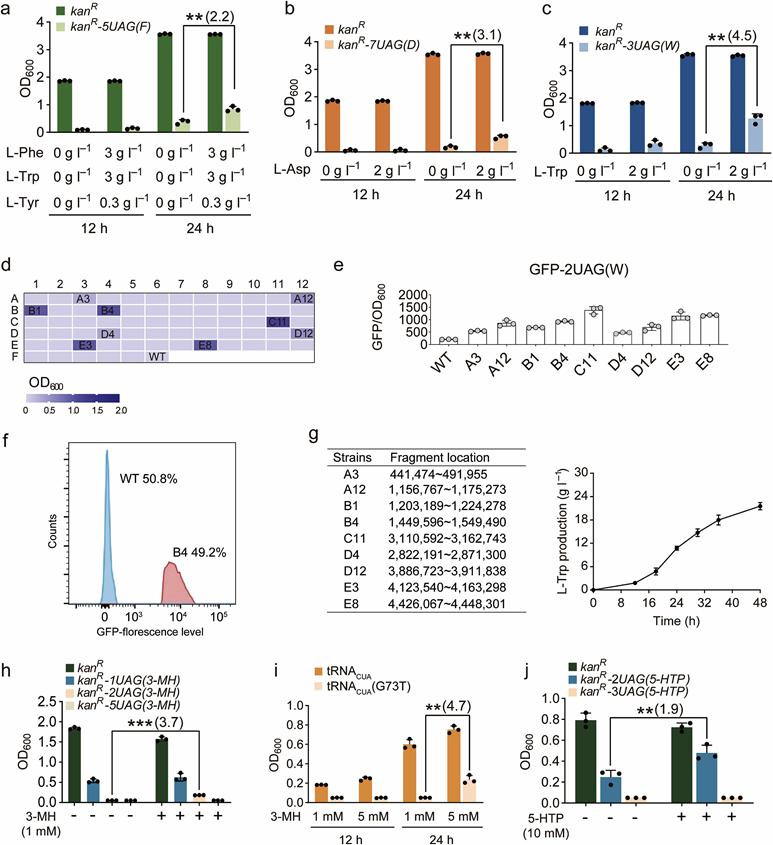 基于上述原理,本團(tuán)隊(duì)提出了一種基于人造tRNACUA的氨基酸高產(chǎn)菌株篩選策略。作為概念驗(yàn)證,通過基于生長和/或熒光激活細(xì)胞分選(FACS)的篩選,分別從大腸桿菌和谷氨酸棒狀桿菌的隨機(jī)突變庫中篩選出L-色氨酸、L-苯丙氨酸和L-天冬氨酸等五種氨基酸的高產(chǎn)菌株,并構(gòu)建了L-半胱氨酸,L-賴氨酸,L-甘氨酸和L-谷氨酸以及兩種非蛋白質(zhì)氨基酸(5-羥基色氨酸和3-甲基-組氨酸)的選擇系統(tǒng)。為了進(jìn)一步降低篩選標(biāo)記的設(shè)計(jì)難度和提高本策略的通用性,在氯霉素抗性基因 cm 的5′末端添加了一段富含UAG的Tag序列,建立了一種改進(jìn)的篩選標(biāo)記。這種標(biāo)記基因可以適用于對所有氨基酸高產(chǎn)菌株的篩選,并且可以通過簡單的PCR法改變UAG的數(shù)量,來調(diào)節(jié)篩選強(qiáng)度的大小。隨后,還證明了該策略可以被推廣至大腸桿菌MG1655,XL10-gold,C321.?A和谷氨酸棒狀桿菌。