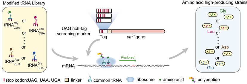 氨?;且环N兩步多底物反應(yīng),其速率不僅取決于兩種主要底物tRNA和氨基酸的濃度,還取決于它們各自與氨?;厦福╝aRS)的親和力。抑制這些因素中的任何一個都會破壞氨?;^程,而促進(jìn)其他因素應(yīng)該可以補(bǔ)償這種負(fù)面影響。基于這一原理,可以根據(jù)目標(biāo)氨基酸,使用與aaRS或aaRS-aa親和力降低的tRNA,篩選目標(biāo)氨基酸的高產(chǎn)菌株。其中,改造tRNA的反密碼子是一種通用且簡便的降低其與aaRS親和力的方法。而在所有64個密碼子中,琥珀密碼子UAG通常不編碼氨基酸,將tRNA的反密碼子更改為UAG互補(bǔ)三聯(lián)體(CUA)提供了一種通用的解決方案,既可以降低tRNA與同源aaRS的親和力,又可以防止干擾其他氨基酸的正常翻譯。