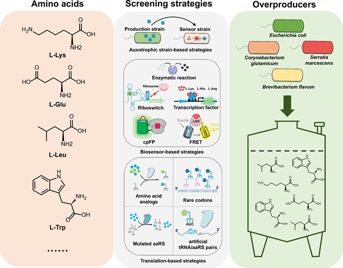 氨基酸已被廣泛應(yīng)用于食品、動物飼料、制藥和化妝品行業(yè)。到2026年,全球氨基酸市場價值預(yù)計(jì)將達(dá)到296億美元,復(fù)合年增長率(CAGR)為6-8%。微生物發(fā)酵是氨基酸生產(chǎn)的主要方法,占全球氨基酸產(chǎn)量的80%。而發(fā)酵的關(guān)鍵是獲得高性能的發(fā)酵菌株。目前,氨基酸高產(chǎn)菌株的選育主要依靠構(gòu)建突變庫和后續(xù)篩選,突變庫的建立方法已經(jīng)較為成熟,而篩選策略往往決定了是否可以獲得理想的氨基酸高產(chǎn)菌株。