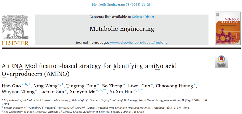 近日,北京理工大學(xué)霍毅欣教授團(tuán)隊(duì)在氨基酸高產(chǎn)菌株的篩選策略方面取得重要進(jìn)展。相關(guān)成果以“A tRNA Modification-based strategy for Identifying amiNo acid Overproducers (AMINO)”為題,在頂級期刊《Metabolic Engineering》(影響因子:8.829)上發(fā)表(doi.org/10.1016/j.ymben.2023.04.012)。該工作以北京理工大學(xué)為第一通訊單位,霍毅欣教授和馬曉焉特別副研究員為共同通訊作者,已出站博士后郭昊及王寧博士為共同第一作者。