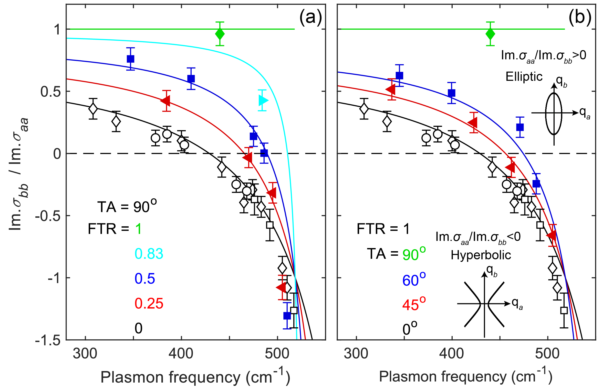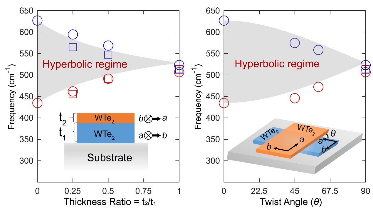 針對(duì)以上問題,研究人員選擇最近發(fā)現(xiàn)的天然雙曲等離激元材料WTe2作為研究對(duì)象,并制作了雙層轉(zhuǎn)角結(jié)構(gòu)。通過改變旋轉(zhuǎn)角度(Twist Angle)和薄膜厚度比(Thickness Ratio),研究人員詳細(xì)研究了雙層結(jié)構(gòu)中天然雙曲區(qū)間頻率的變化。研究團(tuán)隊(duì)分析了非圖案化薄膜的消光光譜,并對(duì)斜帶狀陣列中等離子體極化激元強(qiáng)度的偏振依賴性進(jìn)行了細(xì)致研究。兩種探測(cè)方法均表明,通過改變薄膜厚度比和雙層旋轉(zhuǎn)角,可以實(shí)現(xiàn)極化激元拓?fù)湫詮碾p曲區(qū)間向橢圓區(qū)間的轉(zhuǎn)變。研究表明,這種調(diào)控的關(guān)鍵在于雙曲薄膜整體表現(xiàn)的表面光學(xué)導(dǎo)電率,可以通過將兩個(gè)薄膜的光學(xué)導(dǎo)電率值相加得到。這種方法為所觀察到的膜厚比和扭轉(zhuǎn)角度可調(diào)拓?fù)滢D(zhuǎn)變提供了明確且一致的解釋。